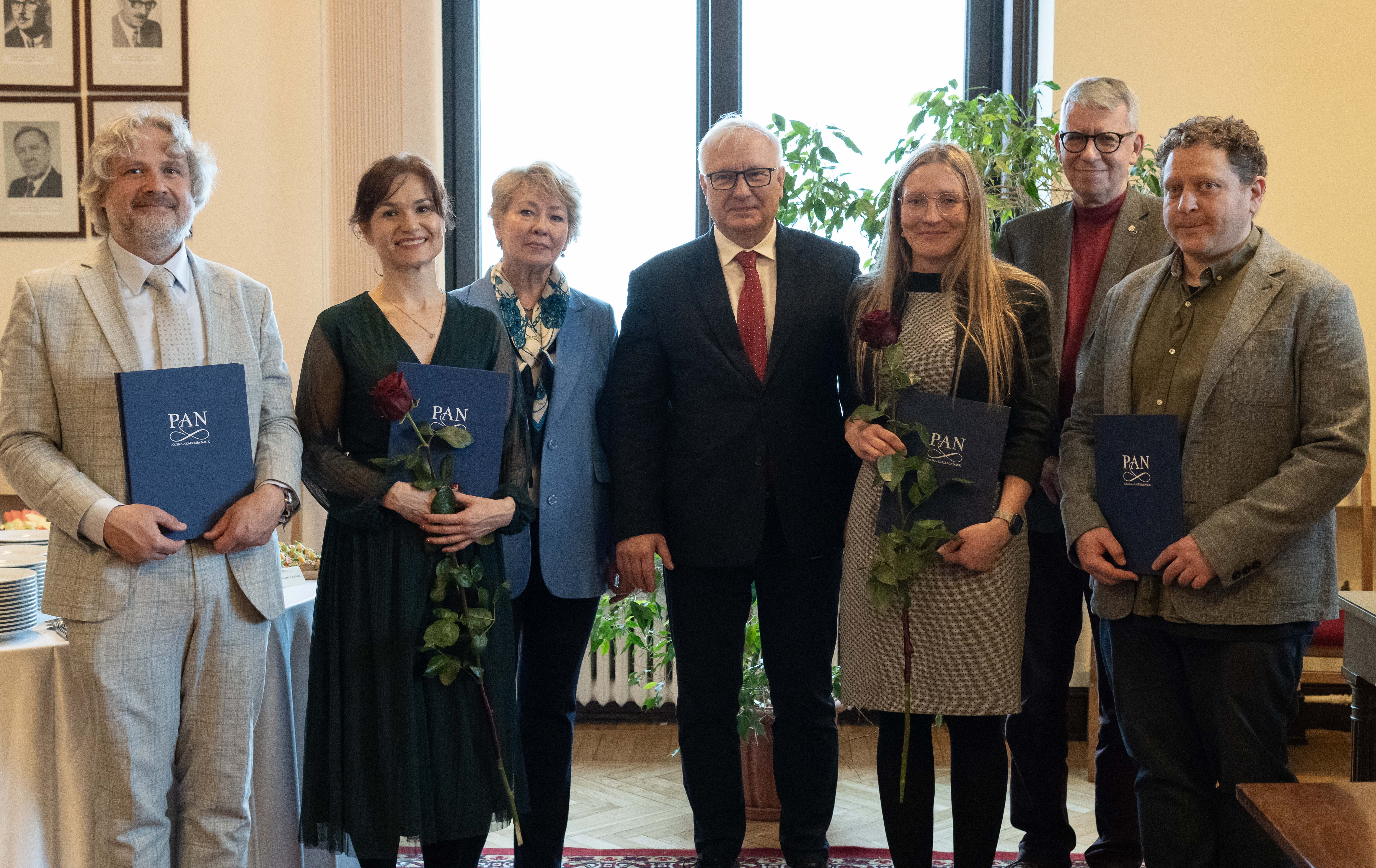 Members of the awarded team: prof. Robert Malinowski, Dr. Karolina Stefanowicz, Dr. Sara Blicharz and Dr. William Truman, and the President of the Polish Academy of Sciences, prof. Marek Konarzewski, vice-president of the Polish Academy of Sciences, prof. Natalia Sobczak and prof. Krzysztof Nowak, Dean of the Second Faculty of Biological and Agricultural Sciences of the Polish Academy of Sciences